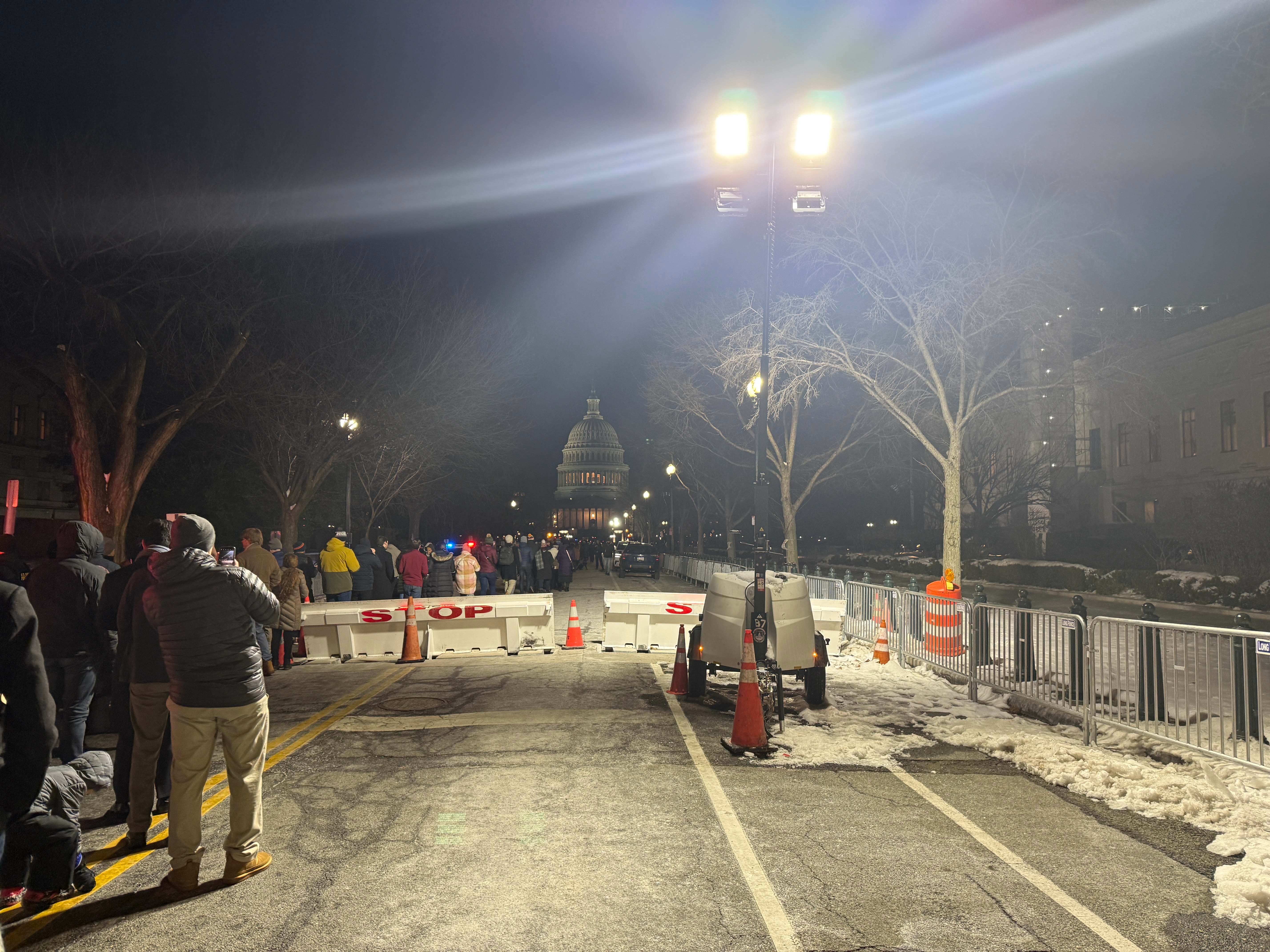 We got off at the Capital South stop and meandered around a little bit among the barricades and roving people working our way towards the building. Eventually a police officer yelled across the street that we were to go over a block and cross at 2nd street. So we did that. Walking down Independence towards the capital proved annoying. It is not clear to me that the Capital groundskeepers have enough in the budget for salt and snowclearing. Snow and ice packed around the metal gratings of the barrier bottoms and parts of the sidewalk were clear and parts were not. Crossing each intersection felt like child's first mountaineering class.